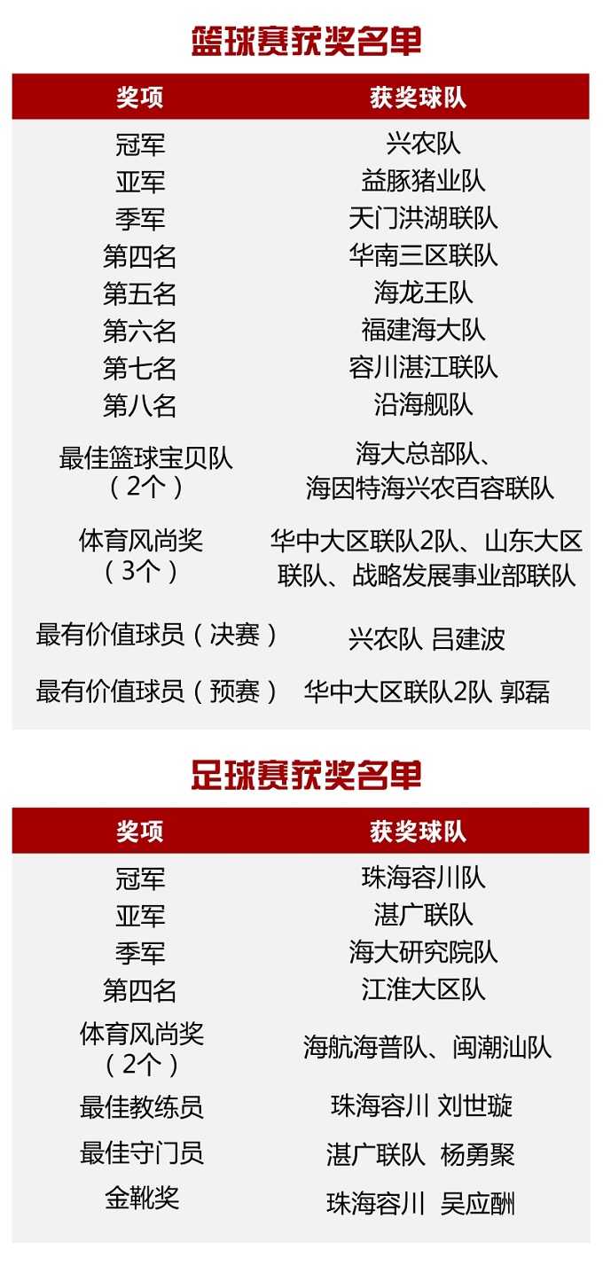 經(jīng)過7天激烈的比賽,決賽中,興農(nóng)隊(duì)以70:28戰(zhàn)勝了益豚豬業(yè)隊(duì),獲得第十四屆籃球聯(lián)賽的冠軍,第二屆足球聯(lián)賽的冠軍則由珠海容川隊(duì)獲得。