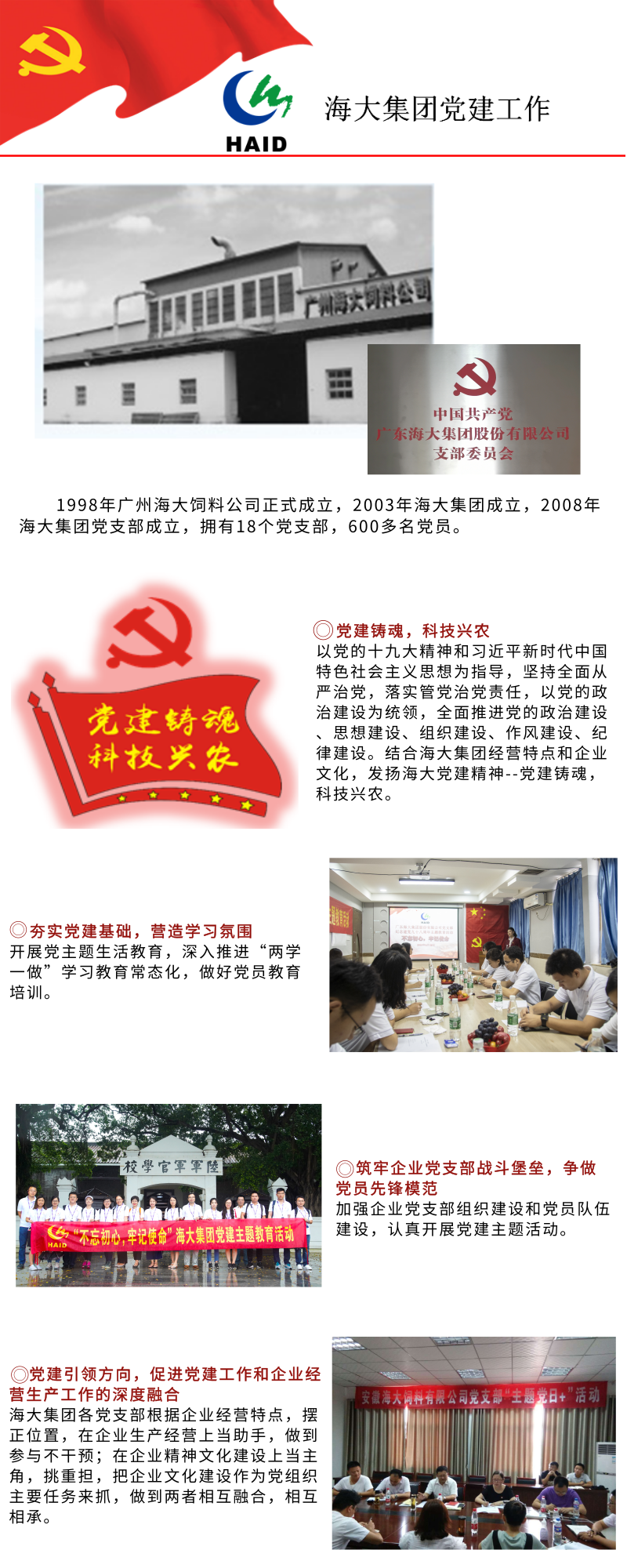海大集團(tuán)高度重視黨建工作,2020年7月成立集團(tuán)黨委和紀(jì)委,截至目前已成立7個(gè)直管黨支部,超40個(gè)雙重管理黨支部。全集團(tuán)黨員超1700名,集團(tuán)總部黨員150多名。海大集團(tuán)黨委厚植“黨建鑄魂,科技興農(nóng)”的家國(guó)情懷,圍繞“四個(gè)引領(lǐng)”目標(biāo),實(shí)施黨建引領(lǐng)高質(zhì)量發(fā)展“四鏈”工作法,始終圍繞主營(yíng)業(yè)務(wù)開(kāi)展工作,著力構(gòu)建高質(zhì)量黨建工作新格局,被評(píng)為 “廣州市先進(jìn)基層黨組織”“廣東省非公經(jīng)濟(jì)組織黨建工作示范點(diǎn)”“廣州市非公有制經(jīng)濟(jì)組織‘雙強(qiáng)六好’標(biāo)桿黨組織”,海大黨建案例兩次入選中國(guó)上市協(xié)會(huì)《民營(yíng)上市公司黨建優(yōu)秀案例》,以高質(zhì)量黨建賦能集團(tuán)高質(zhì)量發(fā)展。
