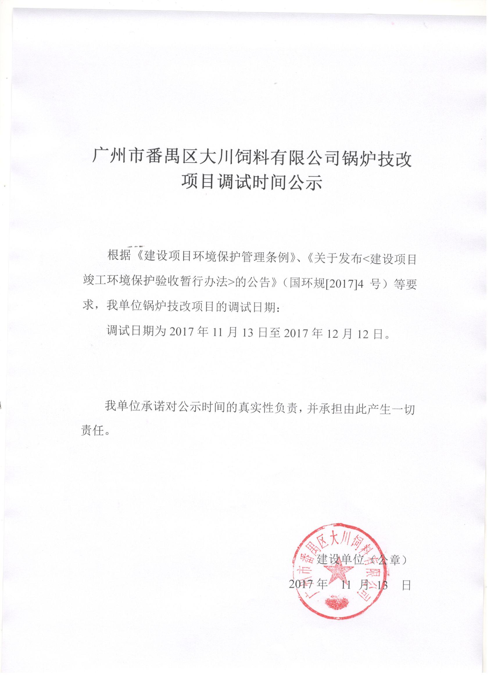 廣州市番禺區(qū)大川飼料有限公司鍋爐技改項(xiàng)目調(diào)試時(shí)間公示