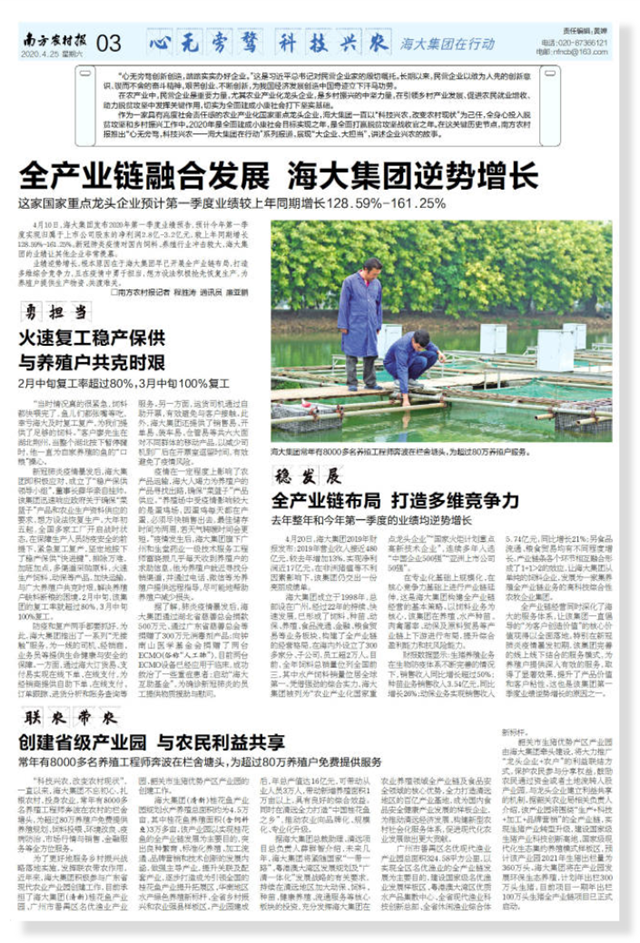作為一家具有高度社會責任感的農(nóng)業(yè)產(chǎn)業(yè)化國家重點龍頭企業(yè),海大集團一直以“科技興農(nóng),改變農(nóng)村現(xiàn)狀”為己任,全身心投入脫貧攻堅和鄉(xiāng)村振興工作中。2020年是全面建成小康社會目標實現(xiàn)之年,是全面打贏脫貧攻堅戰(zhàn)收官之年。在這關(guān)鍵歷史節(jié)點,南方農(nóng)村報推出“心無旁騖,科技興農(nóng)——海大集團在行動”系列報道,展現(xiàn)“大企業(yè)、大擔當”,講述企業(yè)興農(nóng)的故事。